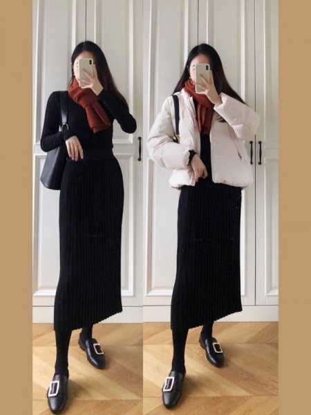 Váy len body cùng áo phao béo tưởng đối lập mà rất hoàn hảo