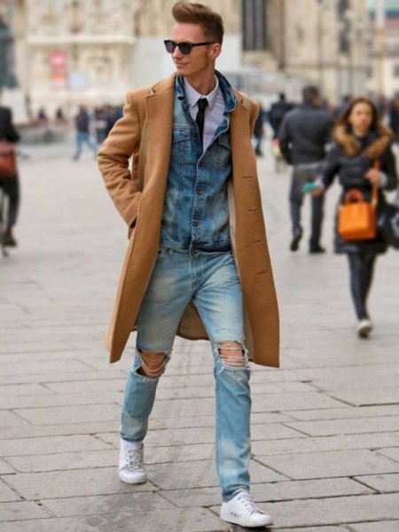 Một phong cách phối đồ mùa đông cho nam siêu đỉnh dành cho những chàng trai trẻ là kết hợp áo khoác dáng dài với quần jeans và áo thun nam phối cùng đôi giày sneaker trắng năng động.
