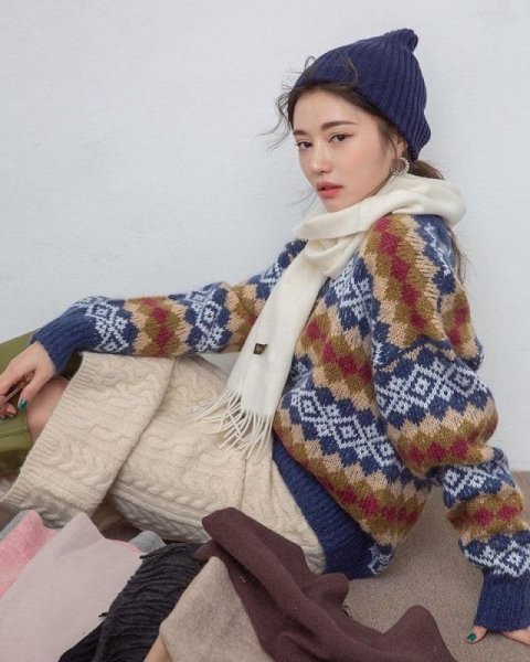 Đầu tiên trong list danh sách áo len thổ cẩm mặc với gì mà bạn có thể chọn chính là kết hợp cùng với chân váy bút chì. Đây là style được các cô nàng nữ tính lựa chọn để diện hằng ngày vào mùa đông vừa ấm áp, dịu dàng lại còn thời trang. Thêm một chiếc mũ nồi nữa thì cứ phải gọi là combo đỉnh cao luôn. Cứ nhìn vào cách mix đồ của mấy cô nàng trong ảnh là rõ ngay ấy mà.