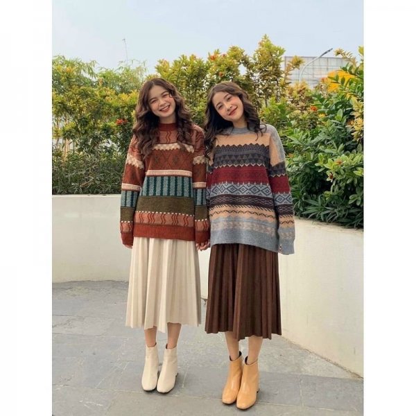 Áo len thổ cẩm mix chân váy xếp ly dài cũng là một gợi ý vô cùng hoàn hảo mà nàng không nên bỏ qua đâu. Một chiếc áo len thổ cẩm nhiều màu nhưng không hề loạn màu kết hợp với chân váy xếp ly một màu nhưng không hề đơn điệu. Sự đối lập này vô cùng bù lắp cho nhau khiến cô nàng trở nên hoàn hảo hơn bao giờ. Cách phối đồ với áo len thổ cẩm này thật bắt mắt đúng không nào. Thêm một đôi boot ấm chân nữa là có thể tung tăng trên mọi con phố để tận hưởng cái se lạnh của mùa đông rồi.