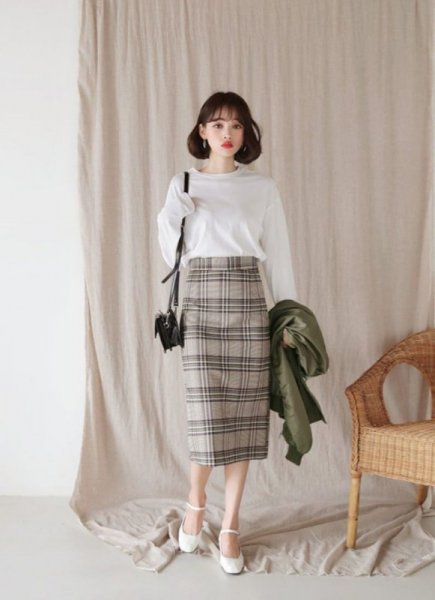 Nếu bạn muốn đổi mới phong cách thời trang trong mùa đông năm nay thì hãy thử kết hợp chân váy kẻ caro dáng bút chì với áo dài tay nhé. Những chiếc áo dài tay kết hợp với chân váy bút chì mix cùng đôi giày búp bê xinh xắn sẽ khiến nàng ấn tượng và nổi bật hơn giữa đám đông.