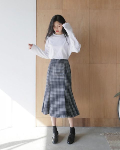Chân váy kẻ caro dáng đuôi cá với áo dài tay