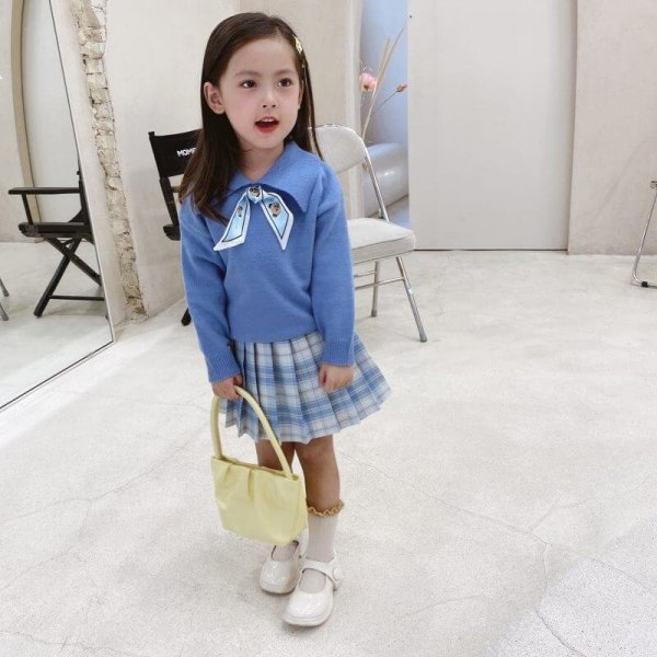 Ngoài ra, bạn cũng có thể biến hóa bé thành nàng công chúa xinh xắn khi mix áo len cùng chân váy. Lưu ý khi phối cùng chân váy, bạn nên chuẩn bị thêm cho bé một đôi tất cao cổ để giúp giữ ấm cho đôi chân bé bỏng của con nhé.