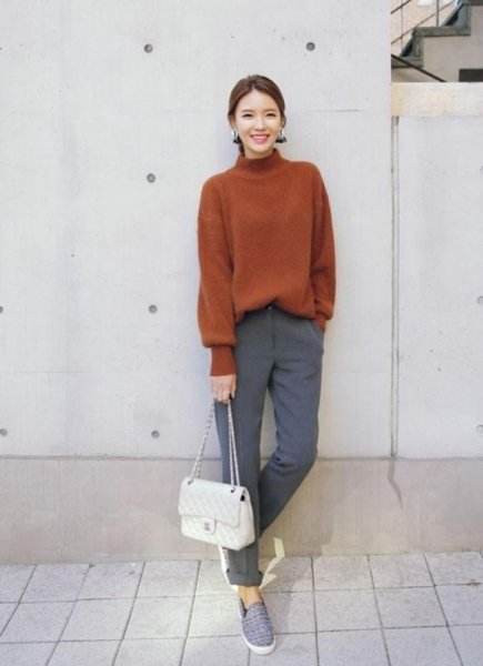 Một chiếc quần tây thanh lịch vẫn có thể kết hợp với áo len và sẽ tạo nên một phong cách mới cho bạn đấy. Sự kết hợp này sẽ mang đến cho bạn một vẻ ngoài mới mẻ nhưng vẫn không kém phần thanh lịch, dịu dàng vốn có. Đây là cách phối được nhiều bạn gái công sở lựa chọn để đến công ty trong những ngày trở lạnh.