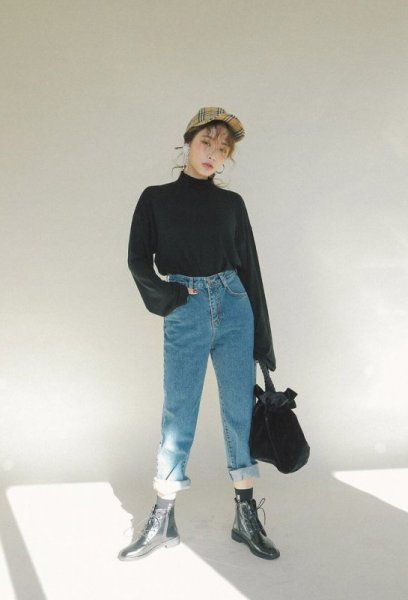 Áo len đen sơ vin kết hợp với quần jean xanh cùng nón lưỡi trai là một gợi ý không tồi dành cho các cô nàng cá tính. (Ảnh: Zstyle.vn)