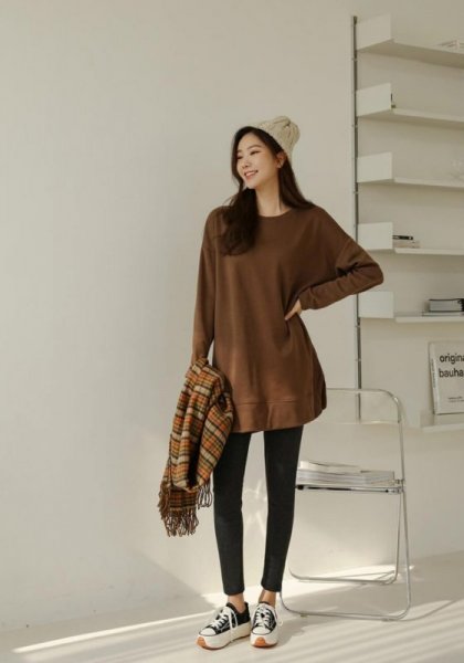 Bạn có thể phối áo len dài với các kiểu quần legging vải da, cotton hay vải thun tùy theo sở thích. Nên lựa quần có lớp lông ở trong sẽ giúp bạn giữ ấm tốt hơn. Để hoàn thiện set đồ, bạn có thể kết hợp thêm đôi giày thể thao yêu thích hoặc giày boots đều nổi bật.