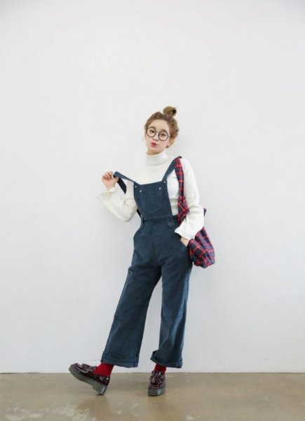 Bí quyết phối đồ theo phong cách Hàn Quốc nữ mùa đông xinh xắn là đây chứ đâu! Áo len cổ lọ vốn dĩ đã rất xinh xắn nên khi kết hợp với quần yếm bò sẽ trông vô cùng dễ thương và có chút tinh nghịch, nổi bật và ấm áp.