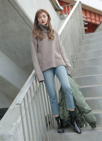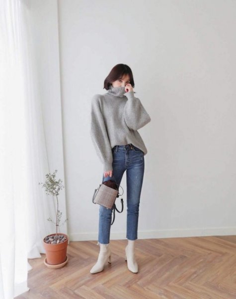Sự kết hợp giữa áo len và quần jeans là xu hướng thời trang mùa đông Hàn Quốc được nhiều cô nàng yêu thích hiện nay. Bạn có thể khéo léo phối trang phục mùa đông này với giày cao gót hoặc giày thể thao cùng một chiếc túi xách giúp bạn trông tinh tế hơn.