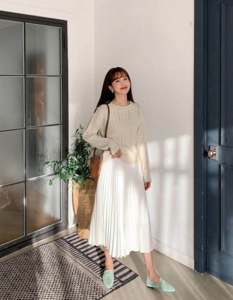 Áo len basic kết hợp với chân váy dài dịu dàng, ấm áp
