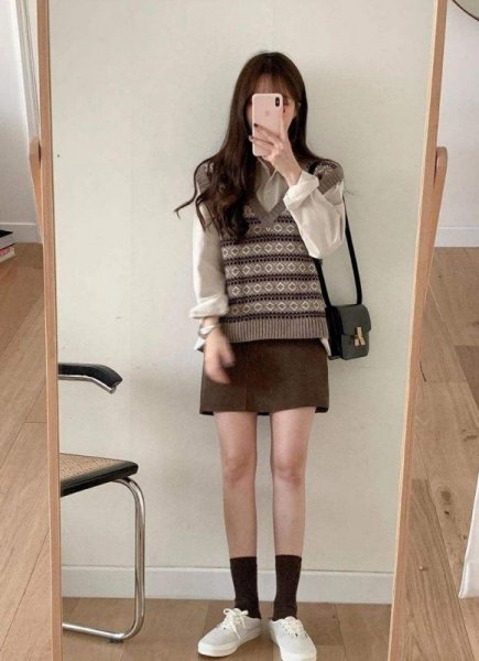 Đây là bí quyết phối đồ Hàn Quốc cực xinh xắn cho các nàng trong mùa đông năm nay. Bạn có thể mặc áo sơ mi bên trong, phối cùng áo gile len bên ngoài và chân váy xòe trông rất xinh xắn và đậm chất “Hàn Quốc”. Đừng quên kết hợp với boot cổ cao hoặc những đôi giày bánh bèo một tí để set đồ thêm hoàn hảo nhé.