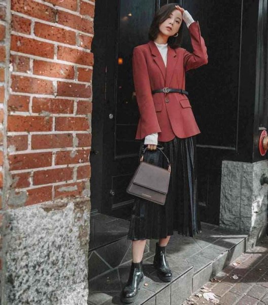 Nếu bạn đang cần một outfit vừa có thể toát lên sự thanh lịch, vừa thể hiện được cá tính của mình, thì set đồ này chắc chắn là lựa chọn hoàn hảo dành cho bạn. Với cách phối đồ này bạn nên lựa chọn những đôi boot cao qua mắt cá chân một chút, như vậy sẽ mang lại sự kín đáo và thanh lịch. Sau đó hãy kết hợp nó với mẫu chân váy dài dáng xòe và một chiếc áo vest. Như vậy là bạn đã có ngay cho mình set đồ hoàn hảo để đi làm hoặc gặp đối tác nhé.