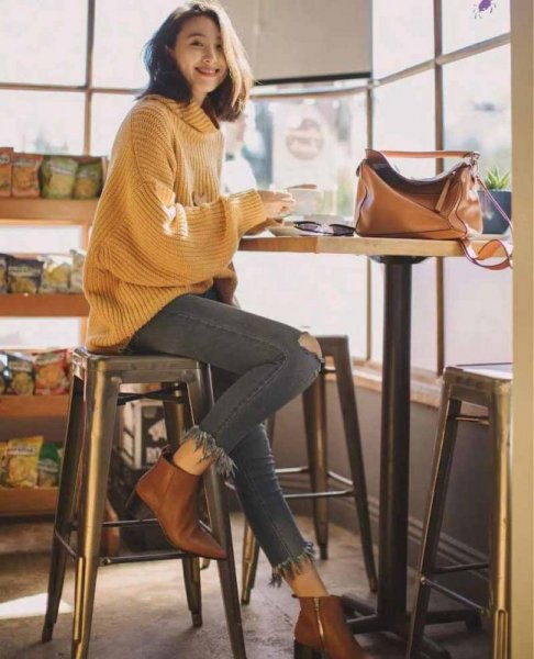 Boot thấp cổ màu da kết hợp với quần jean rách và áo len form rộng