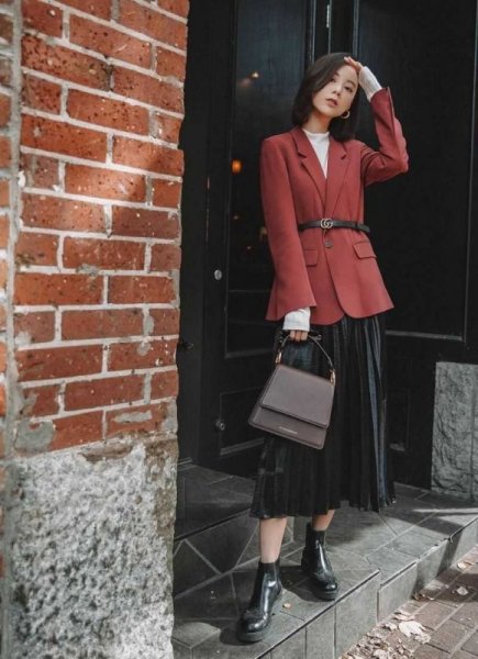 Chân váy midi chính là biểu tượng của sự đơn giản nhưng vẫn mang đậm nét dịu dàng, nữ tính. Mix giày boot cổ ngắn đế bệt với chân váy midi là một gợi ý rất đáng để bạn thử đấy. Giày boot cổ thấp chính là một phần tạo nên sự kết hợp hoàn hảo của chân váy midi mix cùng blazer.