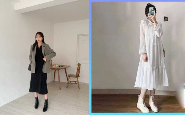 Mix giày boot cổ ngắn đế bệt với các kiểu váy dài liền thân