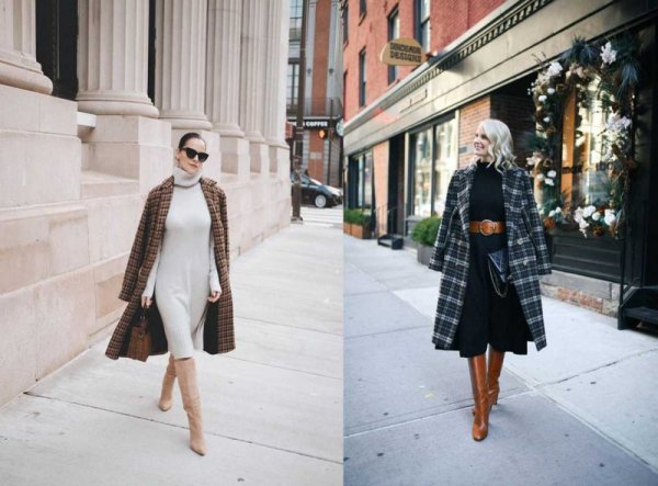 Thu đông là khi thời tiết chuyển lạnh, vậy các nàng có được điệu đà với những bộ váy liền nữa không? Câu trả lời là có nhé. Nàng có thể tung tăng với những “bộ cánh” nếu mix khéo váy liền cùng áo khoác dạ kẻ caro và một đôi bốt cổ cao. Để giữ ấm tốt hơn nàng có thể chọn váy len cao cổ liền bên trong kèm clutch cũng rất thời trang nhé!