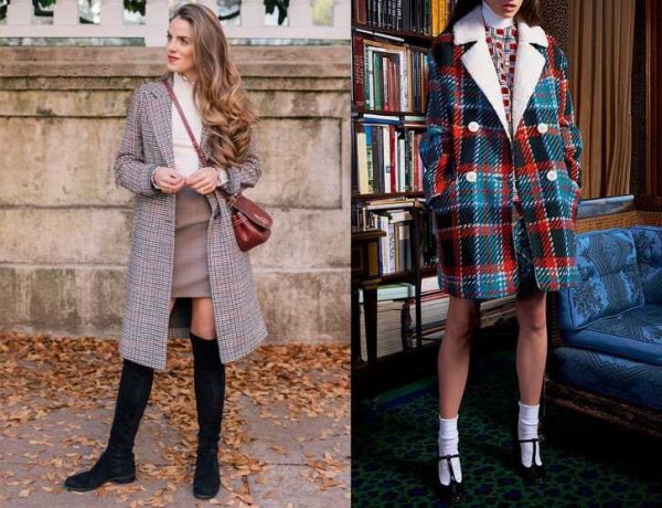 Chân váy ngắn kết hợp với áo dạ kẻ caro