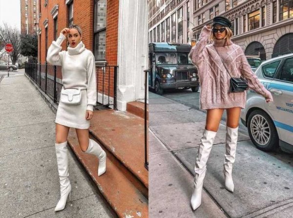 Bốt trắng cao cổ phối đồ gì thì phù hợp nhất? Váy len chính là item được gọi tên đầu tiên. Bốt trắng cao cổ và váy len là cặp bài trùng không thể thiếu trong tủ đồ của các nàng được đâu nhé. Với cách mix đơn giản này sẽ giúp nàng có một outfit cực trendy luôn đấy.