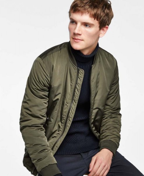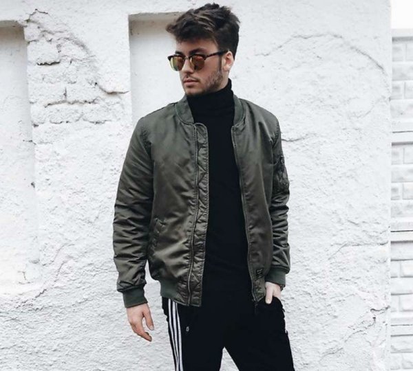 Khi trời trở lạnh, bạn có thể mix áo khoác bomber với một chiếc áo len nam để có thể thoải mái hoạt động mà vẫn ấm áp. Áo len cổ lọ phối với áo khoác bomber nam thực sự là một ý tưởng hoàn hảo dành cho các bạn nam trong những ngày trời se lạnh. Bomber trong trường hợp này thay thế cho áo khoác blazer hoặc coat sẽ giúp người mặc trông năng động hơn.