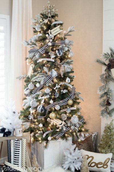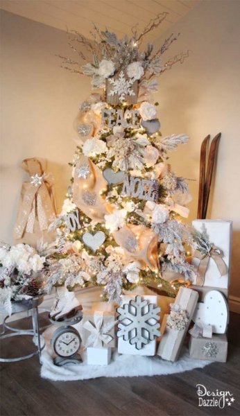 Với những bạn ưa chuộng sự tối giản với tông trắng basic thì đây chính là sự lựa chọn tuyệt vời. Chỉ cần một ít phụ kiện tông trắng như ruy băng, hộp quà, chữ kim tuyến, hoa hồng trắng là đã có ngay cây thông Noel lấp lánh như trong xứ sở thần tiên.