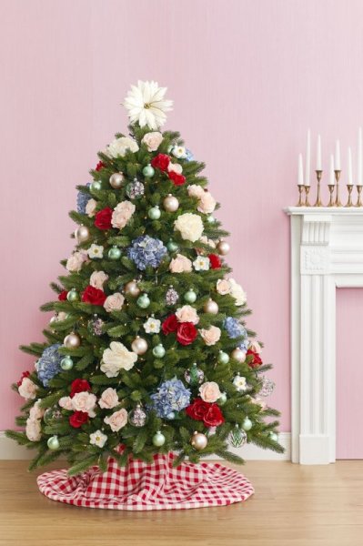 Không gì có thể cấm cản được những nàng thơ yêu hoa khi bạn hoàn toàn có thể kết hợp loại hoa mà bạn yêu thích với cây thông Noel. Bạn có thể tùy ý sử dụng hoa tươi hoặc hoa khô để trang trí và có thể điểm thêm vài trái châu cùng với đèn led nữa nhé.
