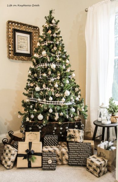 Phong cách trang trí này cũng khá đơn giản như cách ở trên nhưng bạn có thể dùng thêm vài dây ruy băng phá cách để điểm thêm nét chấm phá cho cây thông. Dùng dây ruy băng quấn quanh cây thông, lưu ý là không siết quá chặt để tránh làm gãy các nhánh thông nàng nhé.