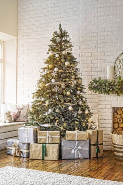Đây được xem là cách trang trí cơ bản và đơn giản nhất nhưng vẫn giúp cây thông trông cực kỳ bắt mắt. Trước tiên, bạn cần phủ lên xung quanh cây thông một ít dây đèn led để tăng hiệu ứng bắt sáng. Lưu ý phủ đều từ gốc cây cho đến ngọn để cây thông sáng lung linh cùng một vài quả thông, một ít trái châu (màu sắc tùy chọn) và điểm thêm vài cái nơ xinh xắn là bạn đã có ngay cây thông chất lừ mùa Noel này rồi.