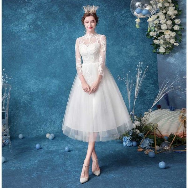 - Váy cưới có chiều dài bằng hoặc dưới đầu gối một chút: Chiều dài này của thân váy tạo cảm giác thanh lịch và cổ điển. Vì vậy, nếu tiệc cưới của bạn tổ chức ngoài trời, theo phong cách nhẹ nhàng, vintage thì có thể tham khảo mẫu váy cưới này nhé.