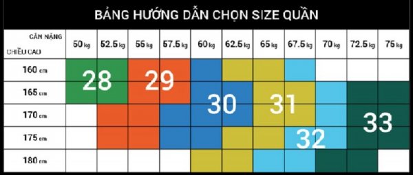 - Size 28 cho nam, có chiều cao từ: 160-165 cm và cân nặng từ 50 – 52,5 kg