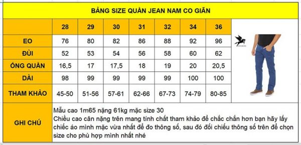 Như vậy, theo thông số của bảng size quần jean nam chuẩn trên thì: