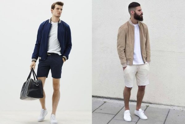 Phối quần short nam với áo thun cùng áo khoác bomber