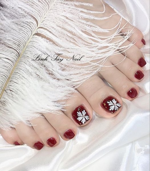 Với những nàng bánh bèo, nữ tính thì những mẫu nail chân có họa tiết hoa cỏ sẽ là lựa chọn thích hợp nhất. Khi đó, bạn có thể lựa chọn những loại họa tiết từ basic đến cầu kỳ cho mẫu nail của mình. Nàng có thể vẽ họa tiết hoa mai hay hoa đào mang đậm nét Xuân cho mùa Tết năm nay hoặc hoa hồng, lay ơn, mẫu đơn cho thêm phần lạ mắt.