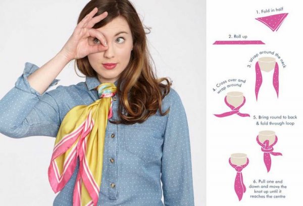 Với cách thắt cà vạt này, bạn chỉ cần phụ kiện duy nhất là bất kỳ chiếc khăn quàng nào, sau đó xếp lại, quàng lên cổ và thực hiện theo các bước bên dưới hình ảnh chỉ dẫn. Chúc bạn thành công với kiểu thắt cà vạt bằng khăn quàng cổ tinh tế và điệu đà này nhé. Để tăng sự điệu đà và sang trọng hãy sử dụng khăn quàng lụa.