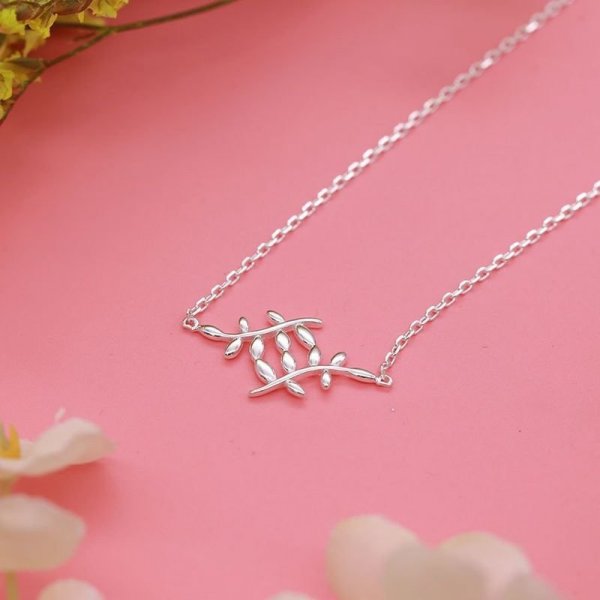 Tương tự như mẫu dây chuyền hình hoa, dây chuyền bạc nữ hình lá cũng có thiết kế đơn giản là mặt dây chuyền hình chiếc lá to, có thể rỗng hoặc đặc ở giữa lá tùy mẫu. Hiện nay có rất nhiều mẫu dây chuyền nữ hình lá đa dạng kiểu dáng như dây chuyền hình lá nhỏ nằm theo chùm hoặc trải dài khắp dây, dây chuyền lá có đính đá quý, hạt, dây chuyền lá phong,… cho bạn thoải mái lựa chọn theo ý thích.