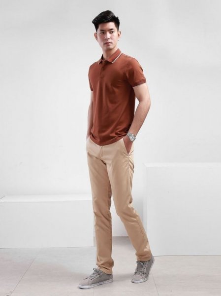 Ngoài những gam màu lạnh như xanh navy, xanh lá cây, xám thì gam màu trầm ấm như màu nâu cũng là sự lựa chọn không tồi, bởi màu nâu có khả năng tôn da rất tốt. Áo phông màu nâu không chỉ giúp bạn trông khỏe khoắn hơn mà còn tôn lên vẻ đẹp nam tính của làn da ngăm đen nữa đấy.. Bạn có thể mix áo thun màu nâu với quần jean, quần short hoặc quần kaki, kết hợp cùng một đôi giày thể thao cá tính là sẽ có ngay outfit cho một ngày năng động và thú vị.