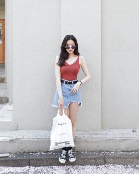 Mix đồ với áo 2 dây và chân váy denim cạp cao