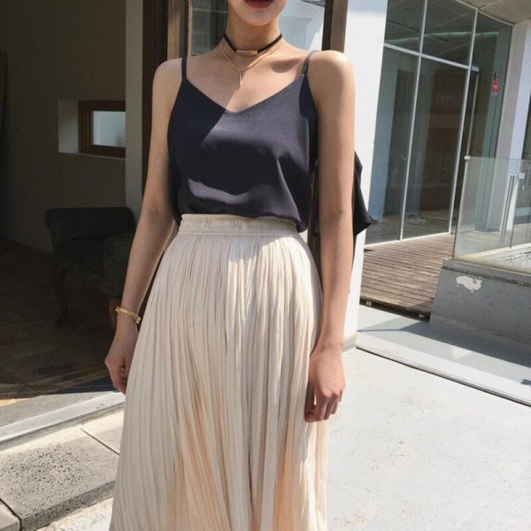 Hình ảnh áo hai dây cùng chân váy midi thướt tha, điệu đà chắc chắn cũng khiến nhiều cô nàng phải say đắm. Để kết đôi hoàn hảo nhất với những chiếc chân váy midi thanh lịch thì không có sự lựa chọn nào hơn được áo hai dây lụa.