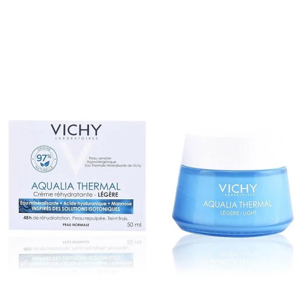 Kem dưỡng ẩm Vichy Aqualia Thermal Hydrating Cream Light là dòng kem dành cho da nhạy cảm với hơn 97% thành phần đều có nguồn gốc từ thiên nhiên. Đường thực vật, muối khoáng, Hyaluronic Acid,… có trong sản phẩm mang đến công dụng cấp ẩm, ngăn ngừa tình trạng mất nước, giúp làn da luôn căng mọng và ẩm mịn trong suốt 48 giờ. Ngoài ra, thành phần Shea Butter có khả năng chống lão hóa hiệu quả, giúp làm dịu da nhanh chóng nếu gặp phải các tình trạng kích ứng hoặc bị dị ứng.