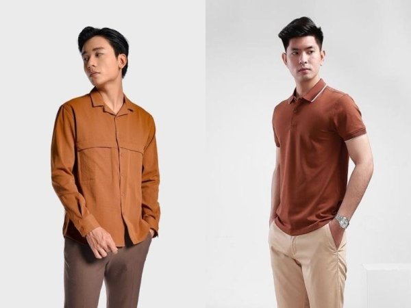 Màu cam cháy là màu các bạn da ngăm nên chọn (Nguồn: Shopee Blog) Các set đồ màu nâu cho nam da ngăm (Nguồn: Shopee Blog)Phối đồ nam đẹp theo mùa