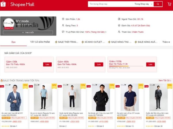 Với phương châm “giúp khách hàng tạo dựng phong cách bằng những tuyên ngôn thời trang”, IVY moda nổi tiếng là thương hiệu thời trang xu hướng hàng đầu Việt Nam. Tại gian hàng Shopee Mall, IVY moda đạt 4.9 sao với hơn 351,000 lượt theo dõi. Chú trọng vào sự thanh lịch của quý ông, thương hiệu có sẵn tất các các mẫu vest, sơ mi, polo hay quần tây để bạn trở nên đẳng cấp hơn với lựa chọn thời trang công sở.