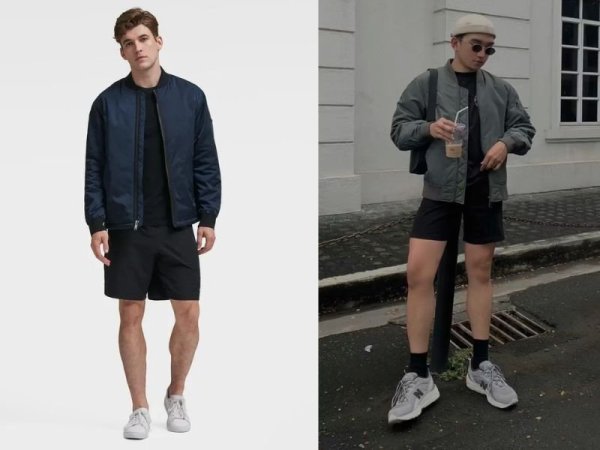 Áo bomber kết hợp cùng quần short là một set đồ ưa chuộng với đa số nam giới trẻ tuổi khi được hỏi mặc áo bomber sao cho đẹp. Các bạn thường sẽ chọn áo thun, quần short với các tone màu trầm như đen, nâu, xám để phối cùng áo bomber. Set đồ này phù hợp để bạn diện đi chơi, đi gặp bạn bè hay tập thể thao ngoài trời như chạy bộ, đạp xe.