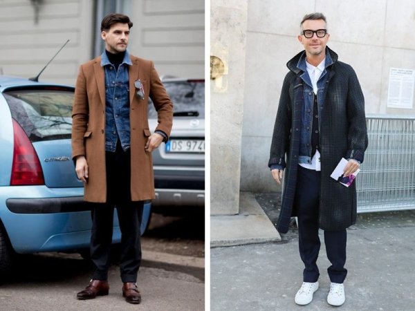 Áo măng tô kết hợp cùng áo khoác jean cực cá tính (Nguồn: Pinterest) Mua NgayPhối áo măng tô nam cùng áo hoodie
