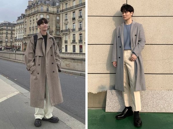 Phá cách cùng áo măng tô nam dáng dài mix quần trắng (Nguồn: Pinterest) Mua NgayPhối áo dạ măng tô nam cùng quần âu