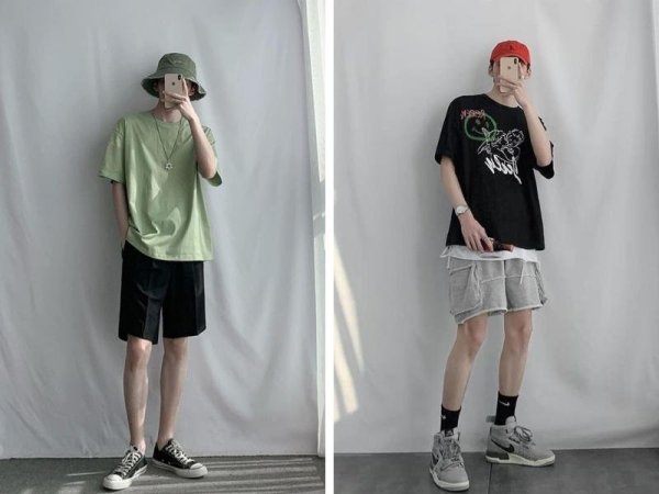 Áo thun form rộng và quần short là cách kết hợp đơn giản và được nhiều chàng trai ưa chuộng, đặc biệt khi vào hè. Hãy ưu tiên những chiếc áo thun có thiết kế phom rộng để thoải mái và dễ vận động. Giày thể thao và nón là hai phụ kiện lý tưởng cho outfit này hoàn thiện hơn.