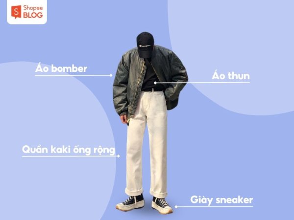 Cách phối đồ với quần kaki ống rộng nam và áo khoác bomber (Nguồn: Shopee Blog)Ngoài ra, một chiếc áo vest cùng màu với quần kaki kết hợp cùng áo sơ mi trắng và một đôi giày Oxford sẽ giúp bạn trở nên điển trai, sang trọng và thu hút mọi ánh nhìn.