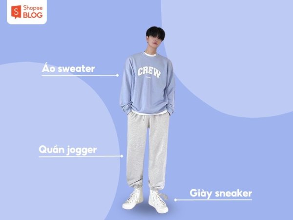 Phối đồ với quần jogger ống rộng và áo sweater (Nguồn: Shopee Blog)Áo sweater rất phù hợp khi phối cùng quần jogger năng động (Nguồn: coolmate)