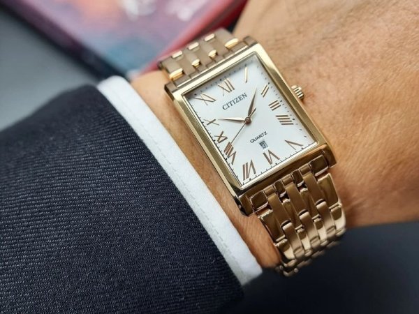 Citizen BH3003-51A có thiết kế vuông vức, kết hợp lớp mạ vàng chiếm 2/3 tổng thể sản phẩm đã tạo nên vẻ ngoài đầy ấn tượng sang trọng của một trong những mẫu đồng hồ nam đẹp. Mặt đồng hồ Citizen BH3003-51A hình chữ nhật, thể hiện rõ nét 12 khung giờ bằng chữ số la mã trên nền trắng vừa thể hiện sự hoài cổ vừa giúp bạn bao quát được trải nghiệm xem giờ.