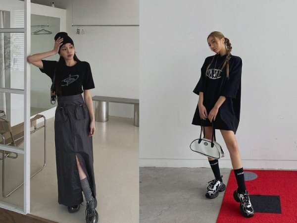 Áo thun đen là item bất bại vì có thể kết hợp với mọi tông da. Bạn có thể mặc áo thun form vừa vặn rồi sơ vin vào váy hay quần, hoặc mặc áo oversized theo phong cách giấu quần.