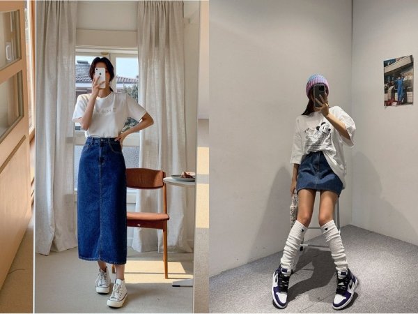 Nếu bạn cần một trang phục nhẹ nhàng để đi làm, đi học hàng ngày thì có thể phối áo thun dáng regular fit và chân váy jeans dáng dài. Còn nếu muốn “cháy phố” cùng bạn bè với một outfit thật chất thì hãy thử mặc áo thun oversized và chân váy ngắn. Đồng thời bạn nên phối thêm các phụ kiện như tất ống chân, mũ len hay giày thể thao để tạo nên outfit đậm chất streetstyle.