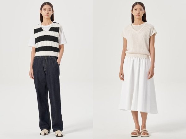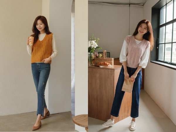 Áo gile cổ tim là loại áo thường được sử dụng khi phối đồ theo phong cách nhiều layer. Bên cạnh đó, bạn cũng có thể phối đồ theo kiểu sát nách và khoe khéo xương quai xanh đối với chiếc áo gile cổ tim này. Quần kaki hay chân váy dài đều là những phương án phối đồ phù hợp.