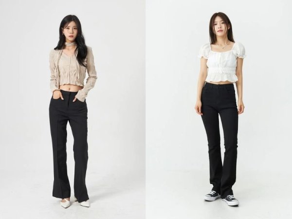 - Dáng nhỏ nhắn: Với chiều cao khiêm tốn, bạn nên chọn quần ống loe có phần gấu quần ngắn hơn và ống chân hẹp hơn so với thiết kế ống loe thông thường.